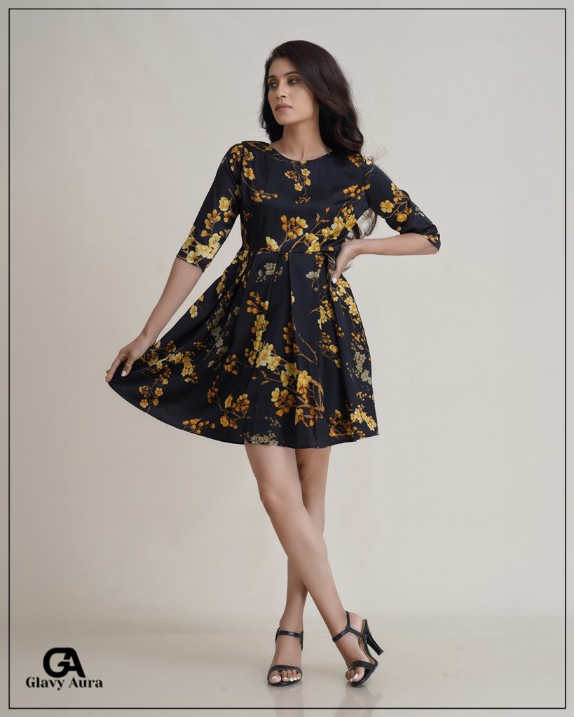 ROUND NECK BLACK AND YELLOW SHORT DRESS